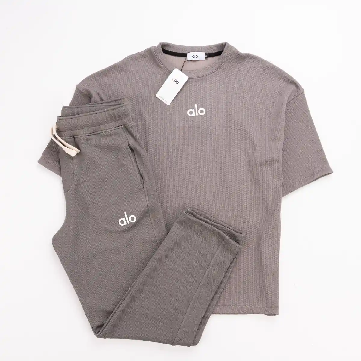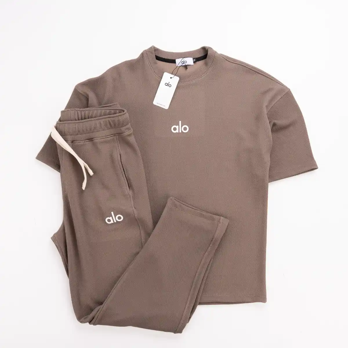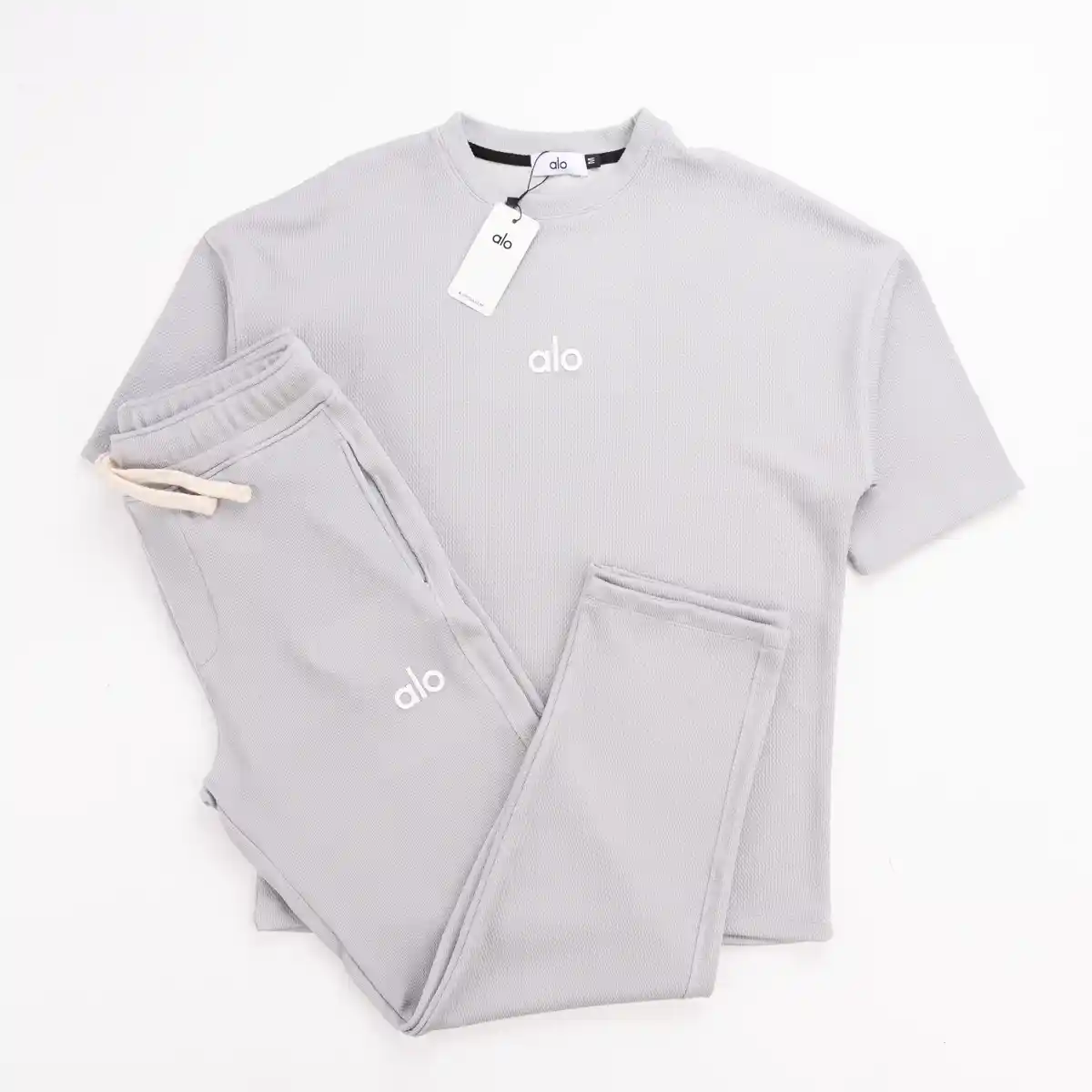 الطقم يتكون من تيشرت وبنطلون برباط وجيوب جانبية.